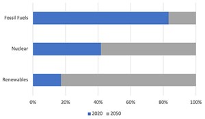 For the 1.5°C Scenario to become a reality, electricity generation must increase more than three-fold by 2050, with a majority coming from renewable sources. According to the International Renewable Energy Agency (IRENA), 94% of H2 production is expected to come from renewables by 2050.1 Additionally, the total primary energy supply by energy group will be 77% renewables, 7% nuclear and 16% fossil fuels in 2050 compared to 16% renewables, 5% nuclear and 79% fossil fuels in 2020.1 This is a 381.25% increase in renewables energy supply (FIG. 1).