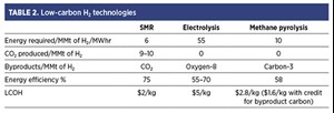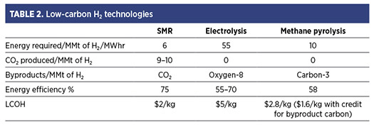 Various researchers, technology providers and process operators have studied the economics of blue, green and turquoise H2 production (TABLE 2). For SMR with CCS, the average LCOH is $2–$3, for electrolysis, it is $5–$6 and for CH4 pyrolysis, it is around $2.80–$3. If credit is given to the carbon byproduct, the latter comes down to $1.80. These figures are based on an average gas price of $9/million British thermal units (MMbtu) and renewable power at $45/megawatt hour (MWhr).