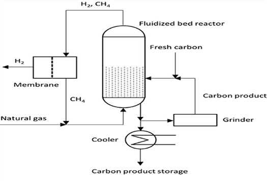 The TNO/C-Zero, a joint research project between TNO (a Netherlands-based independent research organization) and C-Zero (a hard technology startup in Santa Barbara, California), reactor design uses molten metal alloy/salt to facilitate the carbon and H2 bond in CH4 split and frees up both elements. Here, the gaseous CH4 is fed to the bottom of a high-temperature reactor filled with a molten metal as lead (Pb) or a molten metal alloy of nickel and bismuth (Ni/Bi 27:73) heated to 1,300°C. The molten metal promotes the formation of solid carbon and gaseous H2. The molten salt mixture of manganese and potassium chlorides (67:33) is also found to catalyze the reaction. The carbon formed rises through the molten medium and floats at the top from where it is skimmed off and transferred to a carbon tank. A one-third mole of the H2 produced is used to heat the reactor and maintain its temperature while the rest is cooled and stored.