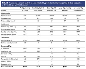 TABLE 2 summarizes a volume and economic analysis of a hypothetical H2 production facility transporting its daily production of 250 metric tpd 1,500 mi to market.17–22 As shown, for such service, airships can transport liquid H2 at a lower cost per kilogram than ships transporting either liquid H2 or NH3.