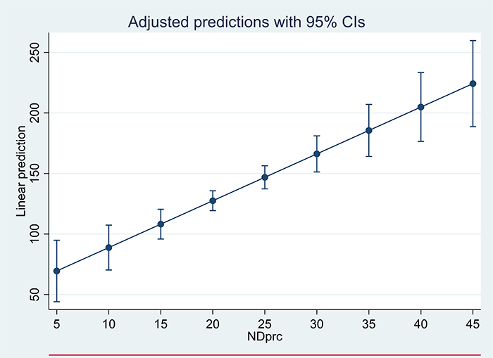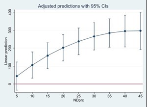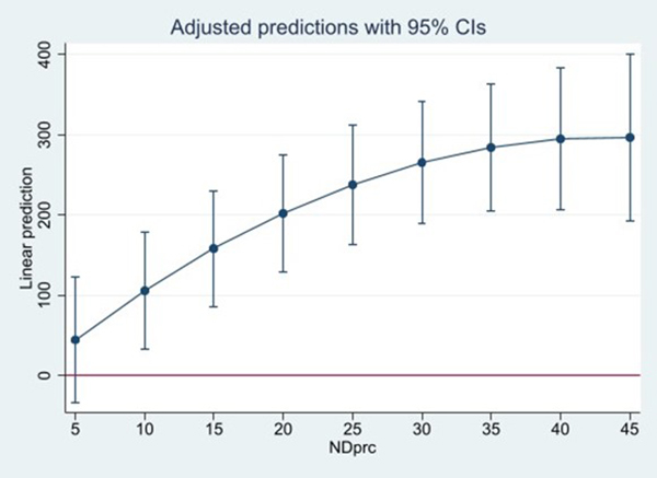 The linear model generally accurately predicts the relationship between wind/solar penetration and balancing costs observed in the data. However, the nonlinear aspect of the electricity supply curve (as presented using real-life data in FIG. 5) suggests a potential escalating level of balancing costs as the % of renewable generation increases. To test this nonlinear hypothesis, Model 4 includes a squared term. Surprisingly, this term is negative, implying that the balancing costs flatten out as renewables penetration increases. This is similar to the empirical finding on U.S. data with ACE as a function of wind generation documented by Godwin and Oliver, who posit diversification effects and economies of scale (FIG. 8).14