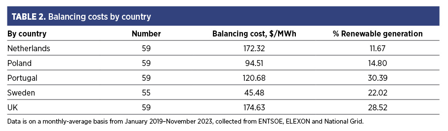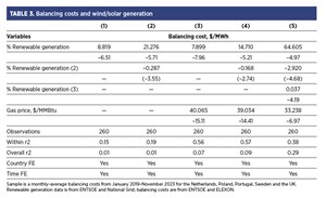 Given that the balancing cost is an average across five countries, the individual country breakout is present in TABLE 2. Note that Sweden has a large amount of hydropower, which is used for balancing, lowering its balancing costs well below the sample average. As of 2023, Poland has a large amount of coal generation, reducing balancing costs. Therefore, all multivariate models use country-fixed effects based on the country-level dispersion. Texas is the closest U.S. parallel to the European market-based system, which reflects much lower balancing costs of between $18/MWh and $38/MWh. This reflects the lower penetration of wind/solar in Texas, its plentiful gas supplies and the slower phase-out of fossil fuel generation.