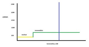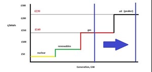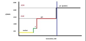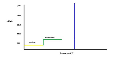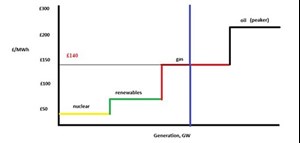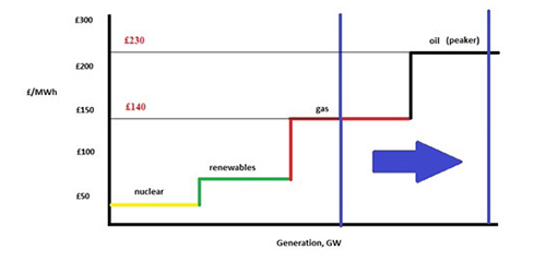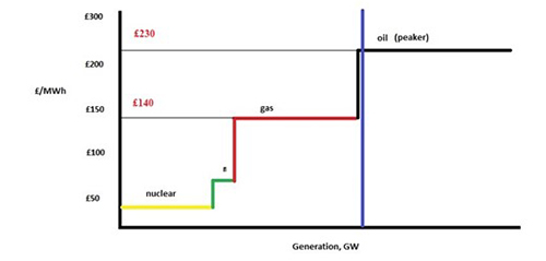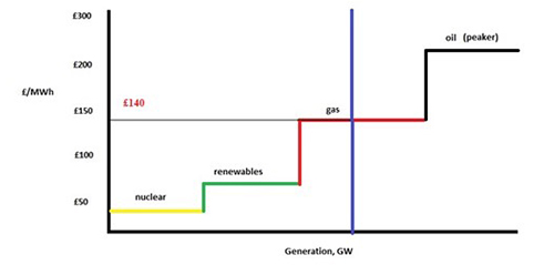 In this example, oil peaker plants are needed to keep the system balanced, and the clearing price increases to £230/MWh. The difference of £90/MWh is a balancing cost that is ultimately passed to consumers.