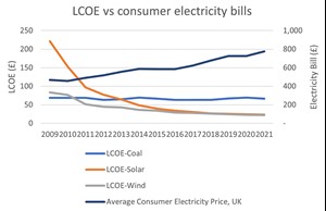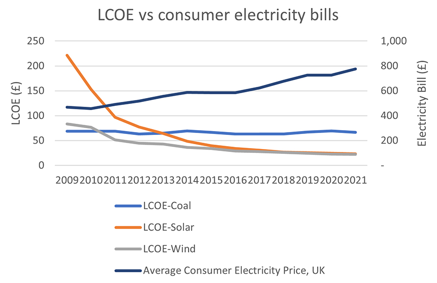 However, an apparent paradox arises when observing the average annual consumer electricity bill, which shows a steady increase despite the declining LCOE for renewables. As renewable energy penetration increases, the weighted-average LCOE should be falling. So, why then are consumer prices increasing?