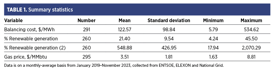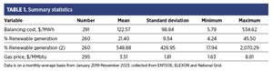 TABLE 1 shows the summary statistics. Balancing costs are presented in U.S. dollars; the average observation is $122.57/MWh. The average % of renewable generation is 21.40% and ranges from 4%–46%.