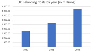 Empirical results. In the economic intuition above, a positive correlation in the time series between balancing costs and renewable generation capacity should be expected. Is this what is observed? FIG. 6 shows the total balancing costs for the UK ESO, National Grid, from 2020–2022.