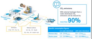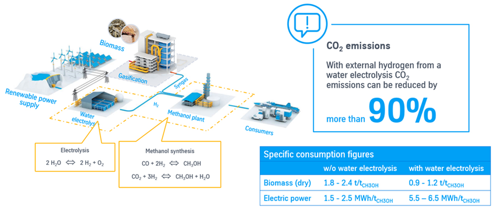 Biomass can also be used to make green methanol via gasification (FIG. 3). This can be combined with water electrolysis to adjust the H2-to-carbon ratio at the beginning of methanol synthesis.