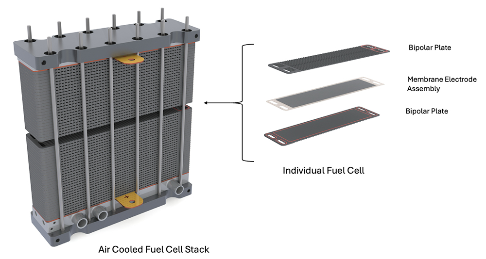 A fuel cell is not dissimilar to a battery, in that the core components consist of an anode, a cathode, a separator (or membrane) that allows only ions to pass through and an external circuit. H2 gas is supplied to the anode, where it undergoes oxidation on the precious metal catalyst, splitting into protons and electrons. The protons travel through the membrane from the anode electrode to the cathode, while the electrons create an electrical current as they move through an external circuit. At the cathode, oxygen molecules react with the incoming protons and electrons to form water. The external electrical circuit allows for current to flow (much in the same way as a battery)—while continuing to provide the electrodes with H2 at the anode and oxygen at the cathode, the current will keep flowing.