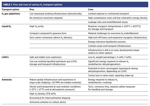 The challenge for H2 is that it is difficult to transport across borders in its elemental form. Whether as a gas or a cryogenic liquid, it presents technical and economic challenges, including low energy density, boil-off losses and costly storage. H2 carriers, such as liquid organic H2 carriers (LOHCs) and ammonia, offer varying trade-offs (TABLE 1).