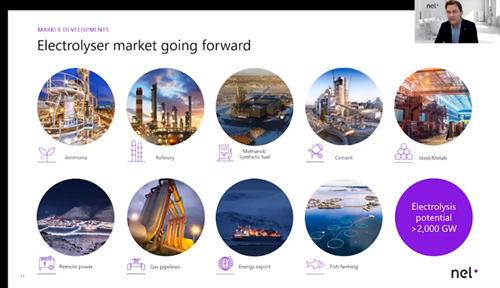Løkke also reviewed Nel Hydrogen's current projects, including its 20-MW green fertilizer project with Iberdrola in Spain, its planned project in Norway with Celsa and Statkraft to produce hydrogen for green steel production, electrolysis supply to a fossil fuel-free steel project in Sweden (HYBRIT), and other projects for mobility, transportation, refueling station and submarine life support applications.