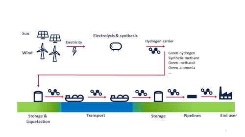 The study concludes that importing this form of renewable energy is a necessary and feasible solution to the growing shortage in Western Europe. Various types of hydrogen-derived carriers from a range of supply regions will be able to provide cost-competitive renewable energy and raw materials by 2030-2035. The most promising green energy carriers are ammonia, methanol and synthetic methane. These can be deployed through existing modes of transport – such as pipelines and maritime transport in particular – and growing markets, encouraging a rapid start.