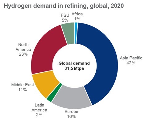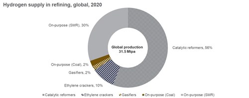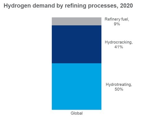 Oil refining is one of the largest markets for H2, accounting for about 32 MMtpy or 30-35% of global H2 demand in 2020. Hydrotreating and hydrocracking are the major refinery processes consuming over 90% of H2 in the refining sector, and they are used to reduce sulphur from finished products, and to increase yield of transport fuels, respectively.