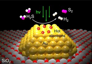 Each molecule of H2S gas contains a pair of hydrogen atoms and one atom of sulfur. Each molecule of clean-burning H2 gas—the staple commodity of the H2 economy—contains a pair of H2 atoms. In the new study, Halas’ team dotted the surface of grains of silicon dioxide powder with tiny islands of gold. Each island was a gold nanoparticle about 10 billionths of a meter across that would interact strongly with a specific wavelength of visible light. These plasmonic reactions create hot carriers, short-lived, high-energy electrons that can drive catalysis.