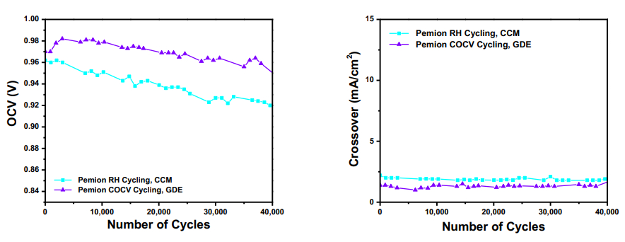 Performance testing on the Pemion membrane and polymer included the DOE, COCV protocol – a combined chemical and mechanical stability accelerated stress test designed for fuel cell membranes – as well as the DOE RH cycling mechanical durability protocol. The tests, which were run for over 40,000 cycles with electrochemical assessments every 24 hours, demonstrated exceptional stability of the membrane in various membrane electrode assembly (MEA) configurations. Critically, MEAs containing Pemion membranes exhibited minimal decreases in open circuit voltage (OCV) throughout the lifetime of the test, alongside exceptionally low and stable gas crossover.