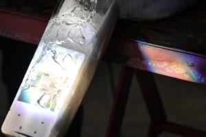 For the outdoor experiment, Zhou set up a lens about the size of a house window to focus sunlight onto an experimental panel just a few inches across. Within that panel, the semiconductor catalyst was covered in a layer of water, bubbling with the H2 and oxygen gasses it separated.