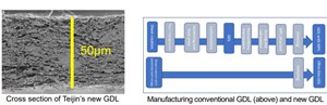 Teijin leveraged its extensive experience with fiber-processing technology to develop PotenCia, an ultrafine fibrous carbon featuring long fibers and high crystallinity. To take advantage of the carbon's thermal conductivity and other special properties, Teijin 50μm Cross section of Teijin’s new GDL Manufacturing conventional GDL (above) and new GDL focused on the possibility to realizing an extra-thin GDL for fuel cells.