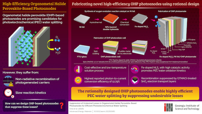 Recently, organometal halide perovskites (OHPs) have emerged as a promising photoanode material on this front. Unfortunately, OHP-based photoanodes suffer from two undesired losses that limit their efficiency. One is an internal loss resulting from a recombination of photogenerated charge carriers (required for electricity generation) within the anode itself, which, in turn, hinders water splitting. The other is external loss due to the slow reaction kinetics of water splitting, resulting in a loss of charge carriers at the interface of the anode and electrolyte.