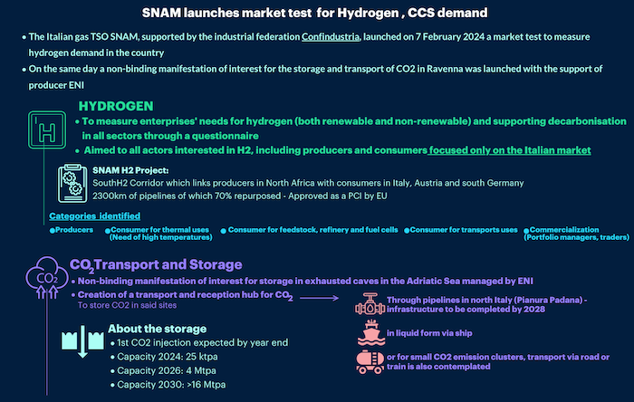 The Italian gas TSO Snam launched a market test to measure H2 and carbon capture and storage (CCS) demand in Italy.