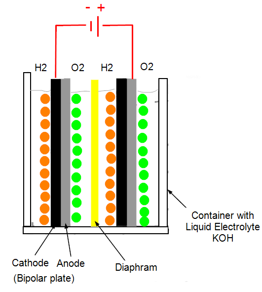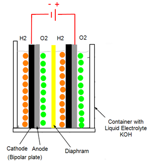 Splitwaters’ alkaline electrolysis module uses bipolar technology, consisting of a series of cells arranged side by side, forming a stack. The liquid electrolyte (KOH) is pumped via the electrolysis stack, where the product gases are formed. H2 is produced at the cathode and oxygen is produced at the anode. Biphasic mixtures, H2 or oxygen plus electrolyte, are conducted to their respective gas-electrolyte separator, responsible for water vapor and KOH removal.