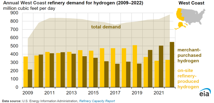 U.S. West Coast refiners are using more H2 purchased from merchant suppliers than from their own production. From 2012 to 2022, H2 purchased by refiners in the region increased 29% to about 550 million cubic feet per day (MMft3d). Over the same period, onsite refinery-produced H2 production from natural gas fell 20% to about 330 MMft3d. Merchant suppliers accounted for more than 62% of the H2 consumed by West Coast refineries in 2022.