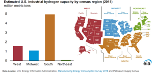 H2 is a critical input for petroleum refining and fertilizer production, and it can also be used as a storable fuel for electric power generation to be used in H2 gas turbines or blended with natural gas for use in traditional gas turbines. It is the simplest element found naturally on earth and is traditionally separated out of hydrocarbons, such as natural gas and coal, through a process known as steam methane reforming (SMR). The 10 MMtpy of H2 produced in the U.S. is almost completely supplied by SMRs or produced as byproduct H2 obtained from a chemical plant or other facility where H2 is not the main product. Using our Manufacturing Energy Consumption Survey 2018—the most recent year for which we have data—and our Annual Refinery Capacity Report, we estimate current U.S. SMR capacity totals 7.6 MMtpy of H2.