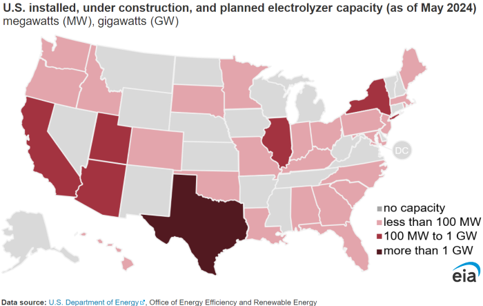 Planned electrolyzer installations that use electricity to produce H2 from water, if built, would expand capacity in the U.S. from 116 megawatts (MW) of current capacity to 4,524 MW, according to information collected by the U.S. Department of Energy’s H2 Program Record. If all the planned projects are implemented, U.S. production of H2 through electrolysis could total about 720,000 metric tpy compared with the current 10 MMt of H2 currently produced from fossil fuels and as a byproduct from other industrial sources. Electrolyzers that meet a threshold for low carbon intensity could qualify for a production tax credit if developers begin construction by 2033.