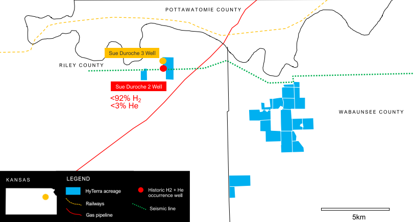 HyTerra Ltd. via its 100% owned and operated subsidiary HYT Operating LLC, has received a Permit to Drill from the Kansas Corporation Commission (KCC) for the Sue-Duroche-3 well at the company’s fully-owned flagship Nemaha Project. The well has been sited around 200 m north of the historic Sue Duroche-2 well drilled in 2009, which reported up to 92% H2 and up to 3% Helium in historic analyses. HyTerra has > 3,450 acres of owned and operated lease holdings geologically contiguous to this well.