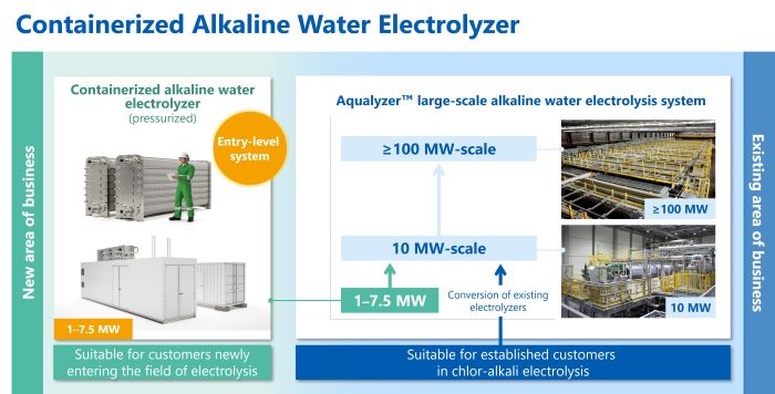 Under such circumstances, an increasing number of companies are newly entering the water electrolysis field. In particular, there is growing demand for compact production systems with reduced costs, installation space, and delivery time serving several industrial sectors, including mobility. To meet this growing demand for smaller H2 production systems, Asahi Kasei has now entered into a collaboration with De Nora, covering technical support, sales, operation, and after-sales service for small-scale containerized electrolyzers in the range of 1 MW−7.5 MW. By doing so, Asahi Kasei expands its portfolio into the range of small-scale containerized pressurized electrolyzers, covering the emerging diversified needs of customers across the entire H2 market.