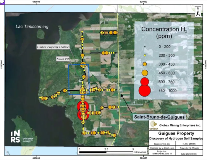 Originally acquired for its potential silica production capabilities, the Guigues property was intended to support our diverse portfolio of advanced silica projects. However, recent H2 exploration activities by Quebec Innovative Materials Corp. (QIMC-CSE, 7FJ-FSE) and the Institut National de la Recherche Scientifique (INRS) in the surrounding area have revealed significant H2 concentrations. Their latest announcement highlights the discovery of H2 at levels exceeding 1,000 ppm—well above the instrumental detection limit.