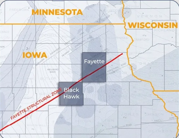 Iowa - Fayette Project. Project Fayette is a new promising natural H2 play, developed around the Northeast Iowa Intrusive Complex (NEIIC), an ultramafic igneous intrusion, with proven high potential natural H2 source rocks (olivine cumulates).