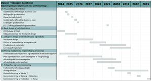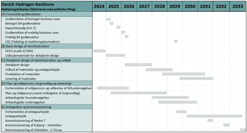 In the maturation application in spring 2023, Energinet presented a schedule that supported the political declaration of intent of 24 March 2023 to have a cross-border H2 infrastructure between Denmark and Germany commissioned in 2028.