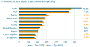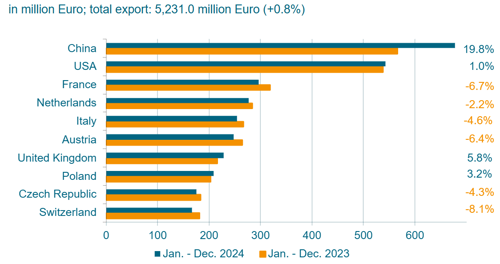 After declines in the two previous years, they climbed by 19.8% to €677.6 MM in 2024. Exports to the second most important trading partner, the USA, increased by 1.0%. Exports thus amounted to 542.7 million euros. Exports to France, on the other hand, fell by 6.7% at the same time. Nevertheless, the country remained the third most important sales market with a purchase volume of €296.8 MM.