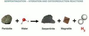 "Metamorphic hydration and oxidation of ultramafic rocks produces serpentinites, composed of serpentine group minerals and varying amounts of brucite, magnetite, and/or FeNi alloys. These minerals buffer metamorphic fluids to extremely reducing conditions that are capable of producing H2 gas. Awaruite, FeNi₃, forms early in this process when the serpentinite minerals are Fe-rich.”