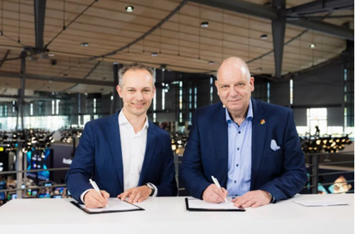 Dr. Dominik Schollenberger, Co-Founder and CTO of TURN2X (left) and Axel Lorenz, CEO of Process Automation Siemens (right), sign the partnership agreement.