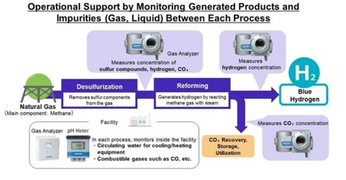 HORIBA’s roles and examples of supplied instruments in the blue hydrogen production process.