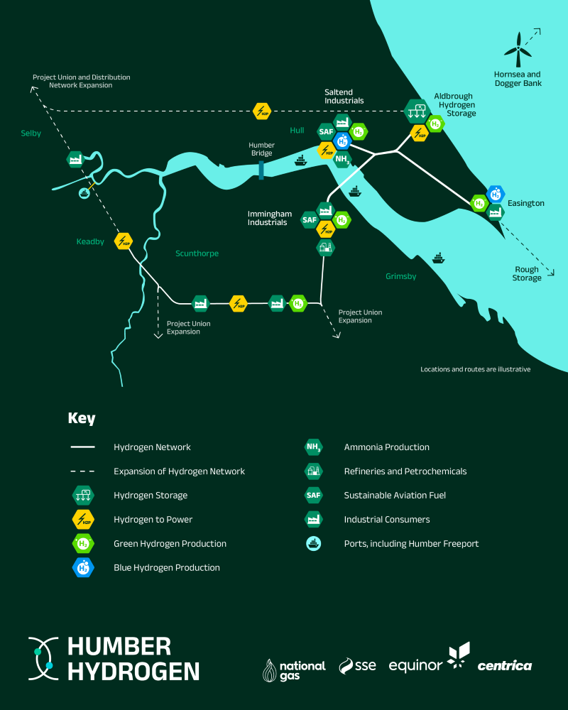 The companies are combining their expertise in hydrogen transport, production, usage and storage to develop a first-of-its-kind coordinated hydrogen network in Britain, connecting projects across Yorkshire and Lincolnshire including locations such as Aldbrough, Easington, Saltend, Immingham and Keadby to link hydrogen production with industrial customers and power stations.